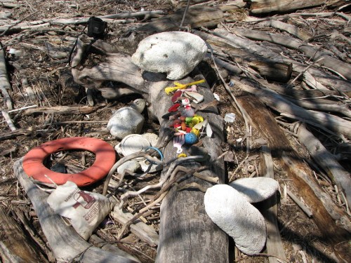 For the moment, I entitled this piece “Figure with Life Preserver”. Naturally, finding the orange ring was a big part of creating this sculpture. Everything I make at the Falls is a combination of artificial and natural materials. The body and head are Styrofoam. The eyes are fishing bobbers and the mouth is a piece of red plastic. The nose, arms, and legs are wood. Oh, and yes this figure’s head also sports a pink “pick” comb. My manipulation of the materials is minimal. Except for shortening the sticks I don’t do any carving on the foam…more on that in later posts. I use what the day gives me and try ultimately to create an interesting image that speaks of that day. To judge scale you will need to compare the figure to what is around it…I think of these things as being the size of life. In the case of this figure, the floating tire is a good gauge of scale. The found objects I didn’t use go back into my collecting bag.