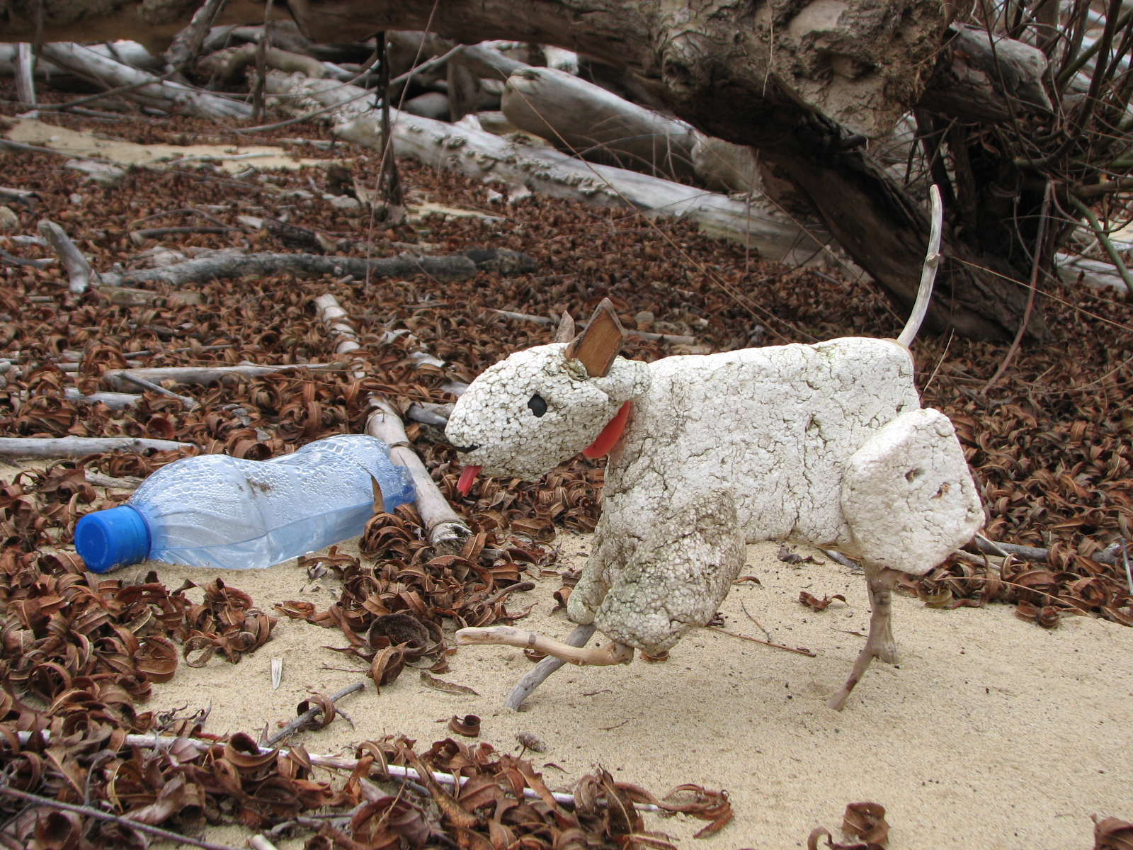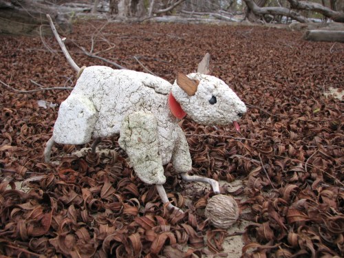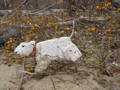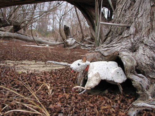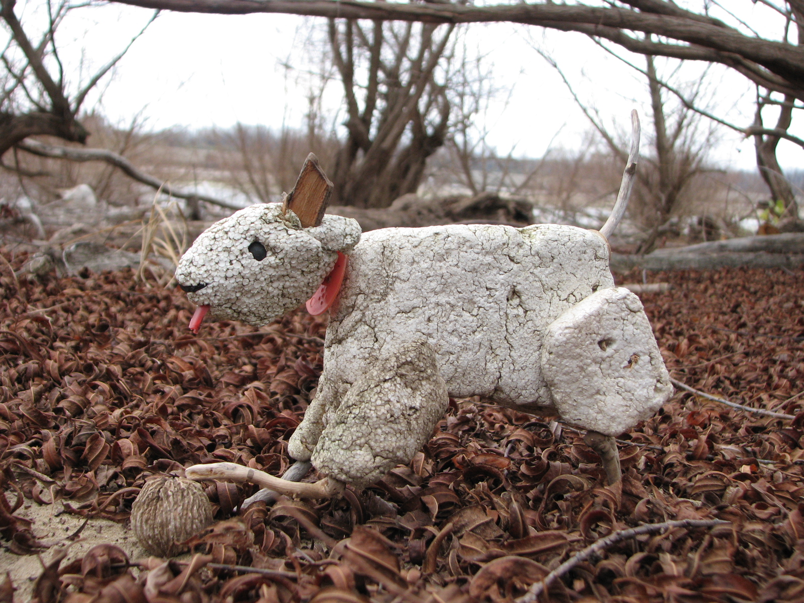 I made these birds from materials I found in the park. All the plastic and Styrofoam elements were once in the Ohio River where they interact with the natural ecosystem. Among the other materials used include: tree bark (for wings), coal (for eyes), and rootlets and twigs (for the legs). I make these artworks to call attention to the condition of the land and water, to draw attention to the unique qualities of this place, to celebrate creativity, and because I love birds! All the photos are mine and shot on location at the Falls of the Ohio State Park.