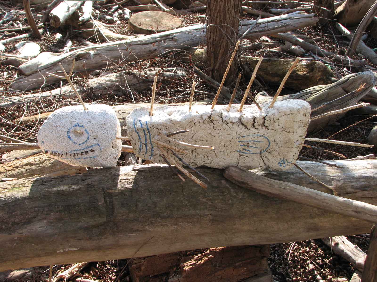 I appreciate that this artist has tried to create some sense of movement out of these static materials. It’s not an easy thing to accomplish. The arm and hand shading the eyes is a nice touch. What I’m less enthused about is the use of the blue marker and the hand-lettered sign. The admonishing tone of the “message” is not my cup of coffee. I’m also not wild about the idea of breaking the Styrofoam up to make the work. I do, however, acknowledge that when you invite others to play…you can’t always control the game. At least whoever made these works attempted something creative which is a message I much prefer sending out into the world. Here’s a better look at the fish sculpture. The spines are beaver-chewed willow sticks.
