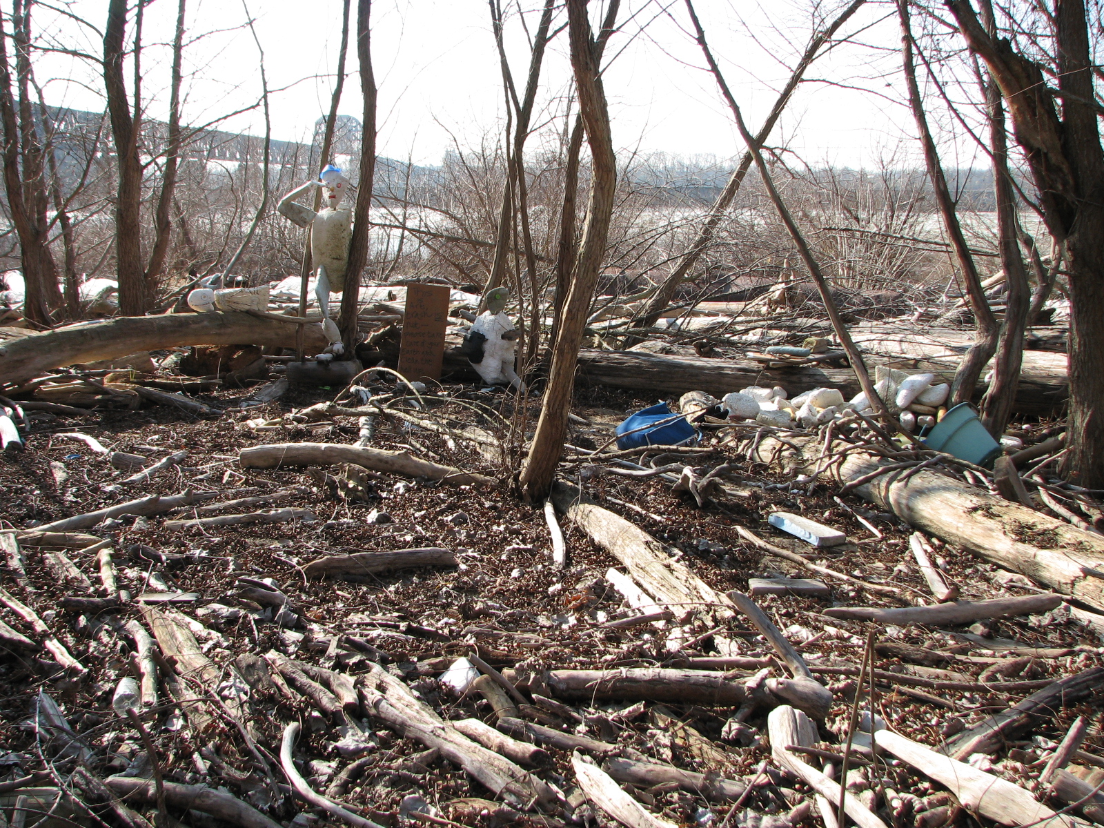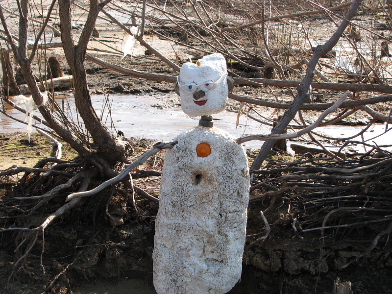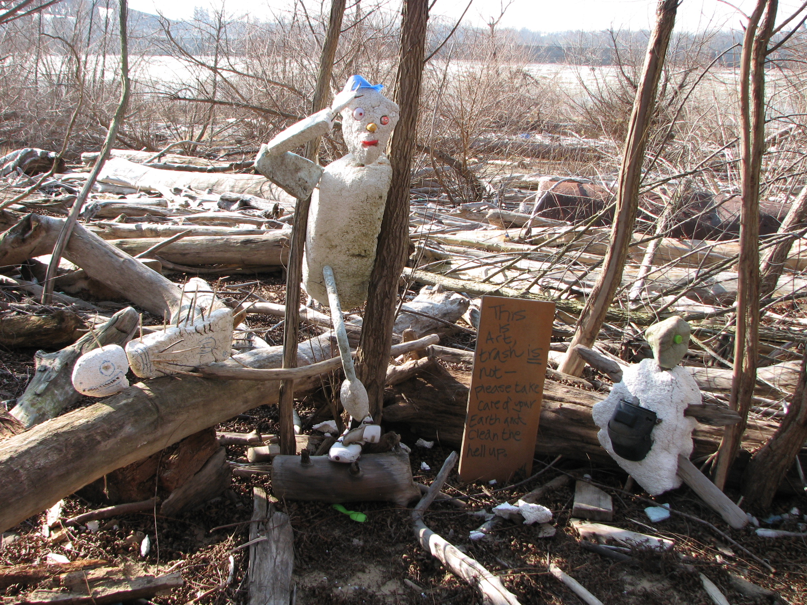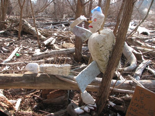 This is the Styro-tableau as I found it. It consists of three polystyrene sculptures and one hand-lettered sign. Whoever this artist is has recycled the head of one of my older pieces (the Watchful Willie figure) and attached it to a “body” of their making. There is also a stylized, abstract “fish” and a smaller, abstract “figure” that’s really crude and falling apart. It must have been made sometime during the week. Also nearby, are a few older works I’ve left behind, but those pieces are undisturbed.