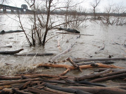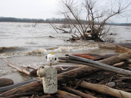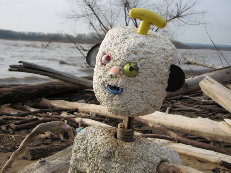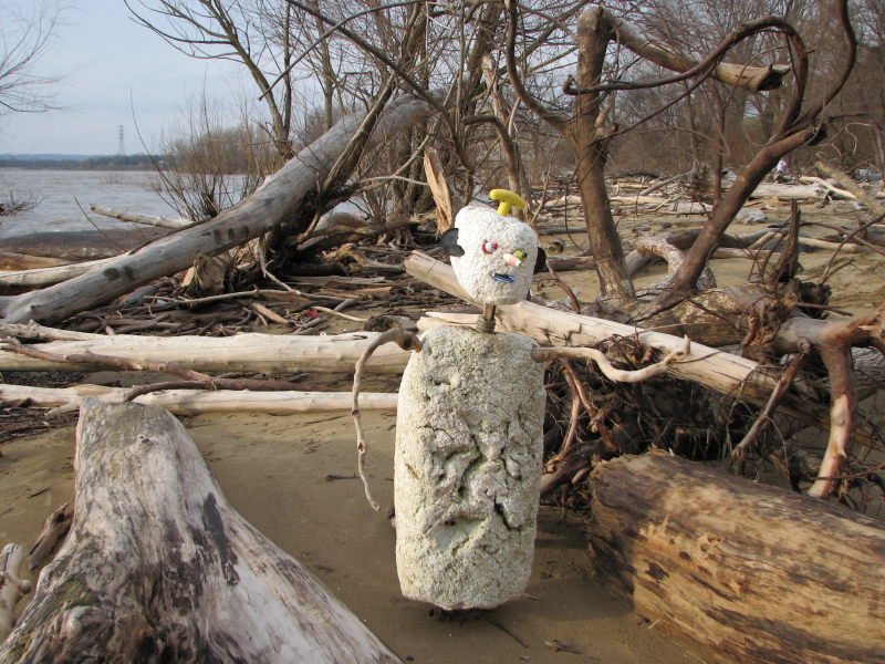The big-nosed figure had a nephew, a child of the high river. His name is Penguin Boy and he was assembled on the same day as his much taller kinsman. Once you see the pictures, it might begin to make sense? This story continues my last post. With the Ohio River rising again, the creeping waters would eventually filter through the driftwood and lift my studio away. It is bound to happen, does so most every winter before the change of the seasons. I’m using the biggest pieces of Styrofoam I have collected from the river, before the water takes it all back again. Here’s the second foam figure I made from river finds this day. He’s considerably smaller and a little odd-looking.
