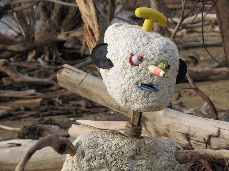 For months, Penguin Boy existed as junk I found along the shoreline at the Falls of the Ohio. I spontaneously assembled its elements and tried to create an image with it before the short winter light diffused into tomorrow. The figure’s eyes and nose are three different fishing bobbers. The ears are two plastic lids from snuff containers. Penguin Boy’s mouth is a squished bottle-cap and the name came to me because of the shape of the body. I don’t know what the yellow “T” is on top of the head, but it is hard plastic. Here are a couple close-up views of the head.