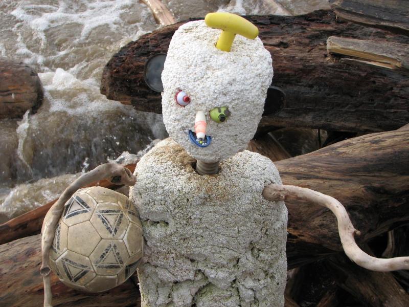 While I’m photographing this figure, the river is just pushing logs into the shallow water. One of my feet is already wet and the knowledge that the other foot is dry is of little comfort! I added this piece to the ensemble I have going back at my studio. I changed Penguin Boy and took a few snapshots with his larger uncle, gathered my stuff and left. I’ll show you images of this duo the next time around. One last image before I go.