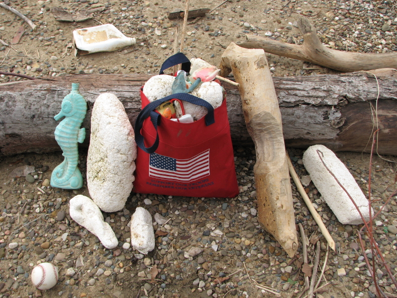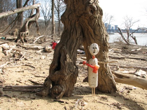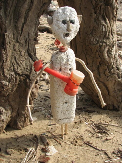 I always keep a few images and ideas in the background in case I need something to post. Since the upcoming weekend is looking like a spectacular one, I know I’ll be visiting the river. Frequently, when I’m on site, I make more than one sculpture and this post is a case in point. I made this figure the same day I did the “Lifeguard” piece. The first image is of one of my collecting bags. Believe or not, I found this flag-festooned bag out here on the river and it has come in handy. Check out that beaver-chewed log and assorted chunks of river-polished polystyrene!