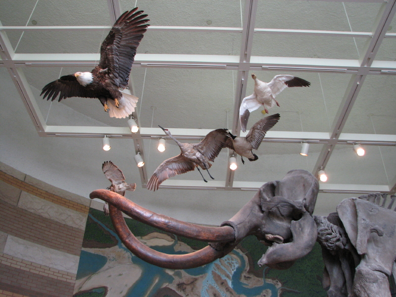 Here’s a third thrush perched upon a vine near the Woodland Trail. I observed this bird picking off very small midge-like flies and returning to this position. On my way back home, I stopped at the Interpretive Center to pick up another bird list for the park. My list is getting a bit tattered from use and I still have about half of the 268 bird species recorded here left to go! I did spot one bird last year in the park that I’m surprised is omitted from the checklist and it’s the American Turkey. It would fit easily in the Game and Marsh Birds category. There are also birds “flying” inside the Interpretive Center and above the mammoth’s head and I’ll end this post with that image.