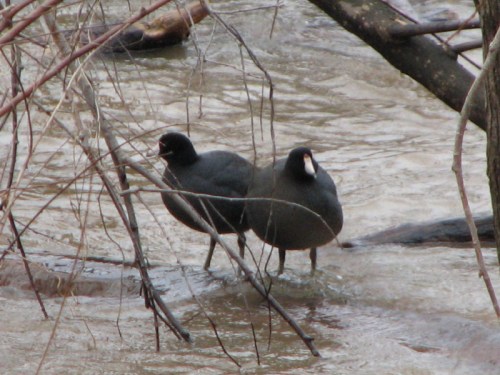 While the river level was still high, I came across this pair of American Coots near the shore. Logs and chunks of wood were bobbing in the water. Their dark feathers took on the look of wet wood. The odd appearance of these coots had to do with them standing on a log that is mostly submerged. Among the other birds I found near the water were Canada Geese, Mallard Ducks, and high overhead…kingfishers.