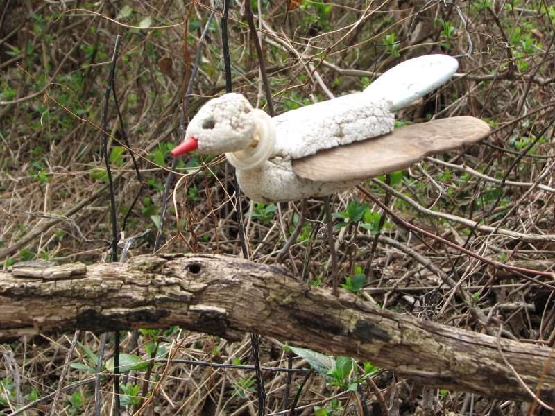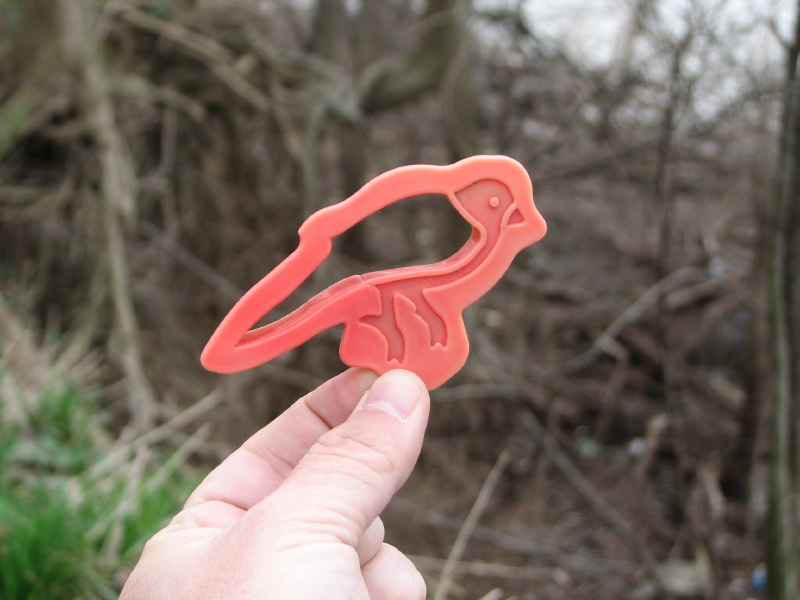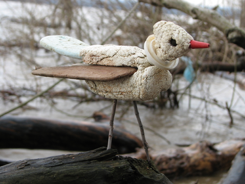 The little red bird perched easily between my forefinger and thumb. I was walking along the river bank and spotted it among the recently deposited debris…another small gift. If I had to guess, I would say that the red bird was intended to be child’s clay tool. It’s like a cookie cutter stencil only smaller. I was on the look out for birds and my subconscious was on alert. I think this is partially why the plastic bird appeared to me when it did. The axiom about chance favoring the prepared mind touches upon this phenomenon.