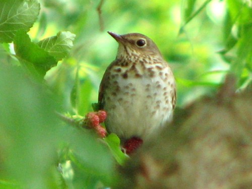 I love this photo! This Swainson’s Thrush seems so happy sitting on its berries. At the Falls the migrant birds are around and our trees are flowering or fruiting. I have been doing my best to come up with some nice bird photos in between other river activities like making art. Most of the warblers are proving to be tough subjects. The difference between getting a nice image and nothing is a thousandth of a second. Warblers are very small and constantly moving. There is a lot of thrush and catbird activity around the sweet mulberries and squabbles are frequent.