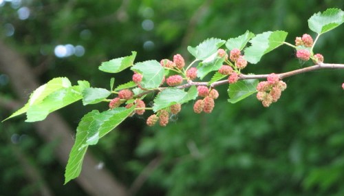 These pink and red mulberries will be ripe when they turn dark and black. That’s when the wildlife particularly go for them. This is a prolific tree and seems to be on the rise.