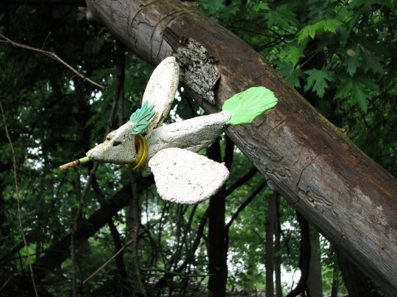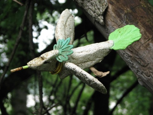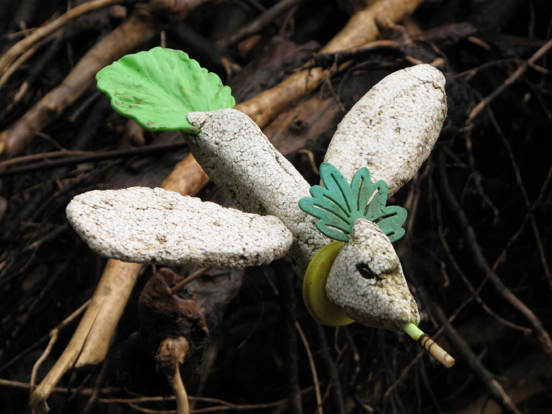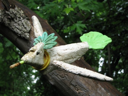 The Cumberland Greencrest was made from materials found entirely within the park and include: Styrofoam (body and wings), wood (its tiny feet), coal (the eyes), plastic ( the bill which was part of a fishing bobber and the tail which is a plastic lettuce leaf!, the yellow collar is from a soft drink bottle) and lastly the green crest is some foam-like material. It is held together in places with small, sharpened wood pegs.
