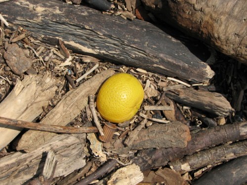 Among my more popular blog entries is my pages section where I feature my Found Fruits and Veggies Collection. Currently, the physical collection is on display at Oldham County. Soon I will need to update those photos featured in this blog because I keep finding more stuff all the time. When I’m in the field, this material is presented by the river in a very causal way. Here’s a picture of my latest plastic orange in situ.