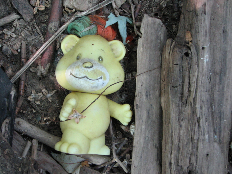 The last several weeks at the Falls have yielded many favorite images that don’t always make it into my posts. Until now. Here’s a collection of found objects photographed in situ at the moment of discovery. Most of the items are lost toys that have travelled with the Ohio River to be washed up here and mixed with wood chips and fragments of our material culture. An example of this is the so-called “Sand Lion” I discovered on the riverbank. It’s rubbery and sticky and the sand clings to it easily. It’s meant to be inflated by blowing through the mouth piece located at the tail. Reminds me of a horned toad the way it lays in the sand. I also came across this variant of a sand lion with its punkish hair style.