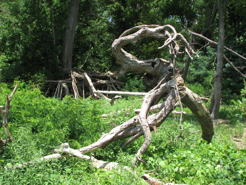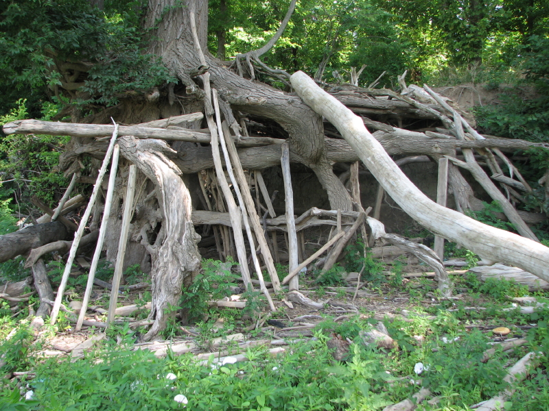Continuing my last walk…I came to the area that would be my base for the day. There is a favorite tree with exposed roots that you can sit under and remain cool and out of the sun. Previous visitors decorated this spot with many vertical sticks that give a fence-like impression. Here’s two views, first the base of this tree as seen from the outside: