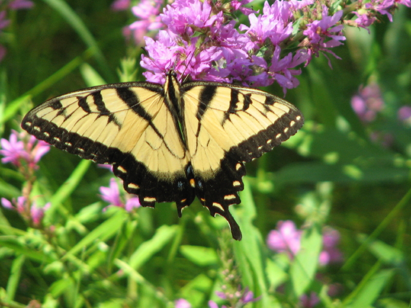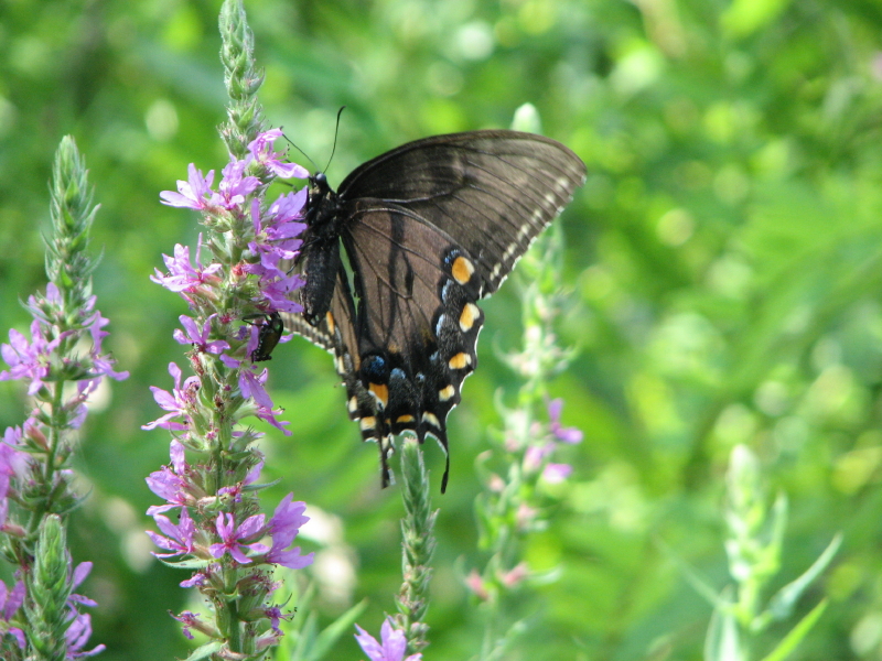 You can see the “tiger stripes” showing on his hind wing. Also working these flowers were the large bumble bees we saw earlier on the morning glories. I also observed several large, blue-black wasps that I associate with being spider hunters. They are so intent on gathering nectar that they pay no attention to me. All through the loosestrife insects were working the flowers. Clearly, this plant has no shortage of pollinators.