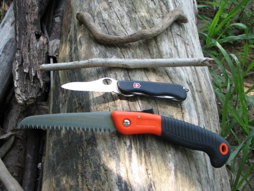 Last week was my birthday, and so on this outing I have new tools. Earlier in the year, I lost my handy two-bladed Swiss Army knife which was a previous gift from a friend. It had a nice, easy to sharpen blade and a toothy saw that could cut wood. Replacing that knife are these two objects. My family gave me the updated Swiss Army knife complete with tweezers and toothpick. My friend Jeff gave me the bigger saw. Its blade folds out and has the advantage of locking. I definitely can chew through a nicely sized limb with this baby!
