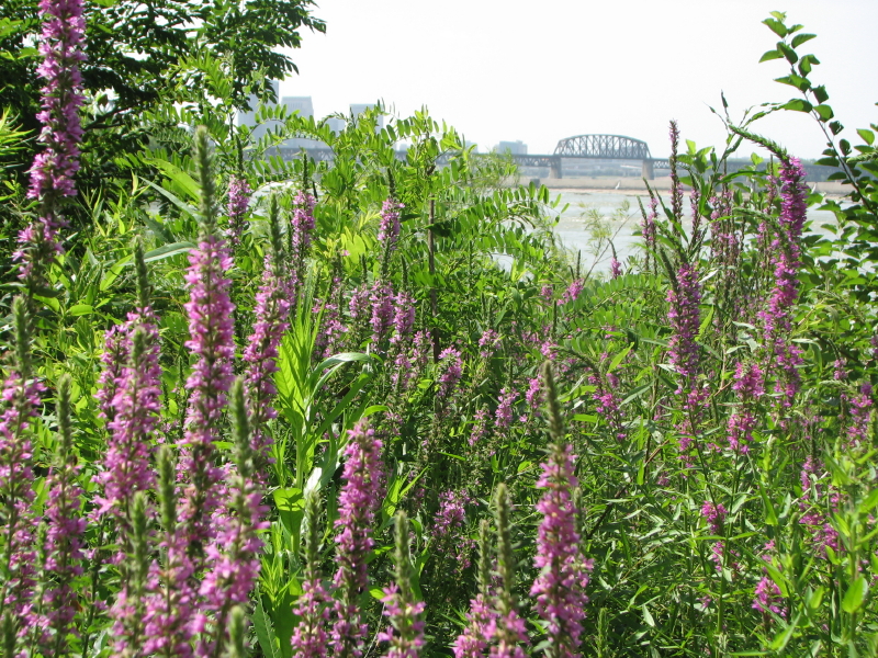All my water is gone and so the idea of returning to my car sets in. I have another bottle waiting for me there. Tomorrow is supposed to be another high temperature day in the 90’s. After our June being a record setter, it seems July is out for bragging rights too. Before leaving, I snap one more picture of the Purple Loosestrife in its prime with the railroad bridge visible in the far distance.