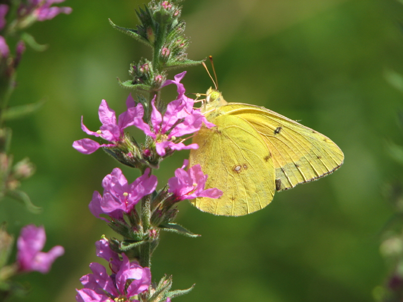 It’s an Orange Sulphur, Colias eurytheme. We have several other members of the Sulphur family out here along with Viceroys, Red Admirals, and a couple different Skipper species. I love the yellow-green eyes on this butterfly which seem to have a glow to them.
