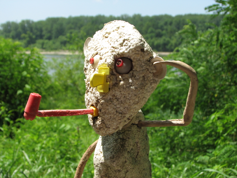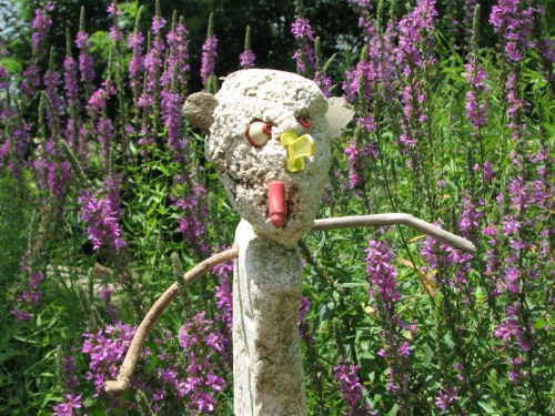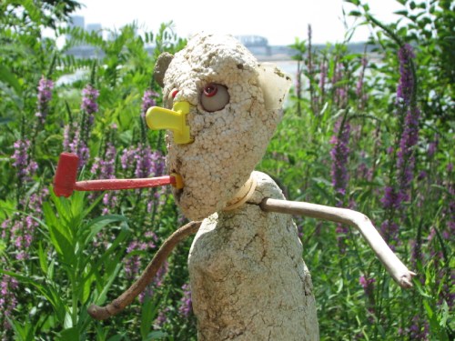 I found a little bit of Styrofoam to work with and this red plastic object that looks like a pipe. I used tiny plastic fishing bobbers for eyes and the ears are clam shells. Later because the shells kept falling off, I substituted a flat rock and sand-polished glass for the ears. It’s subtle and you might not notice this change at first. As for the place I was working at…last year the Purple Loosestrife was getting a foothold and now it is firmly entrenched. This is a hard to get rid of invasive plant that plays havoc in small wetlands like this one. The butterflies, however, love this weed.
