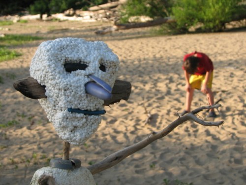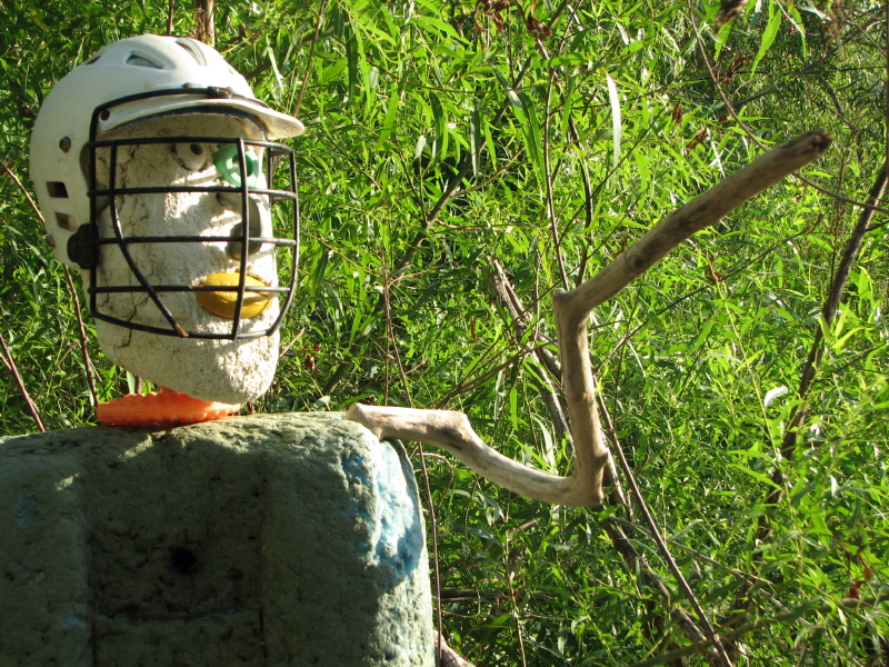 Adam wanted to go exploring around my area and while he did that I made this quick figure. Two pieces of found polystyrene, coal eyes, plastic pen cap nose, wooden ears, plastic mouth, a plastic neck collar, and five sharpened sticks along with a foam letter “A” comprise the materials used to make this guy. By the time Adam got back from circling around the site it was time to go…but first we could make a few photos along the way.