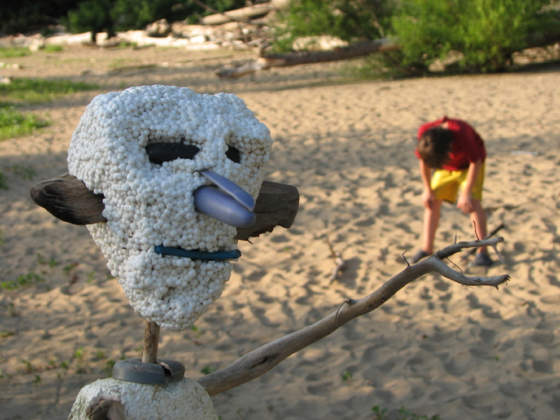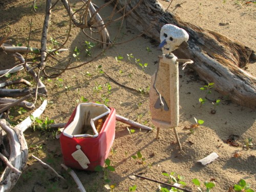 Adam asked me if I had a fort out here like last year? You know, the one with all the Styrofoam in it and if so, are we going there? Barely were the words out of his mouth when he walked into my studio site. Everything was as I left it except for the big helmeted figure which had fallen over. In a way, this piece has become the figurehead of my driftwood boat for this season and as my unofficial mascot I respectfully stood it back up.