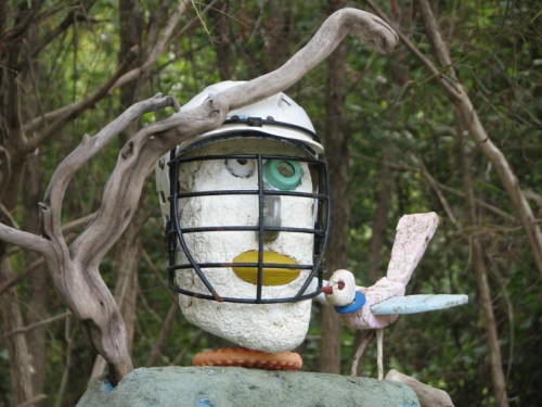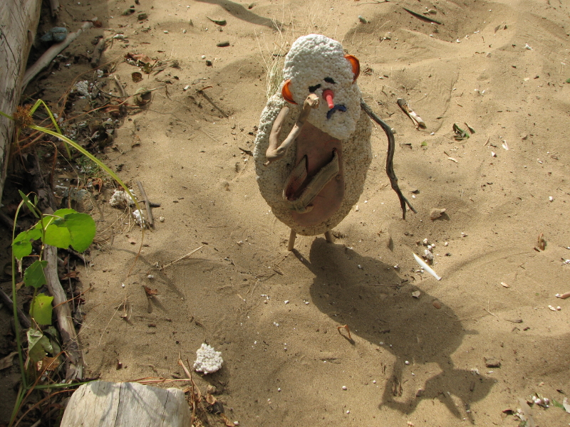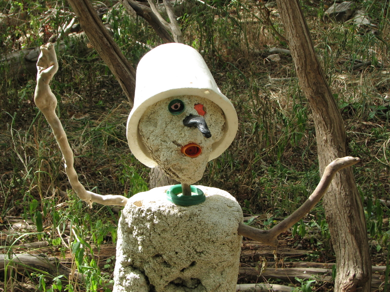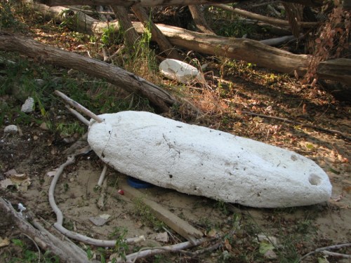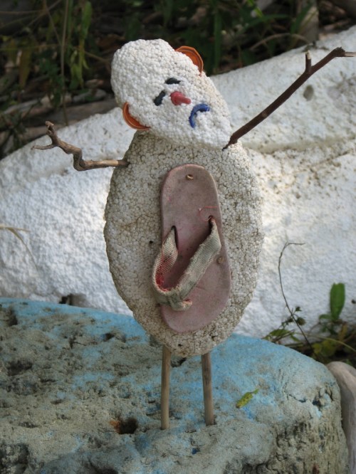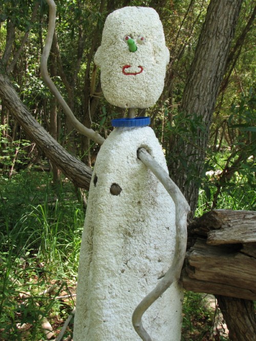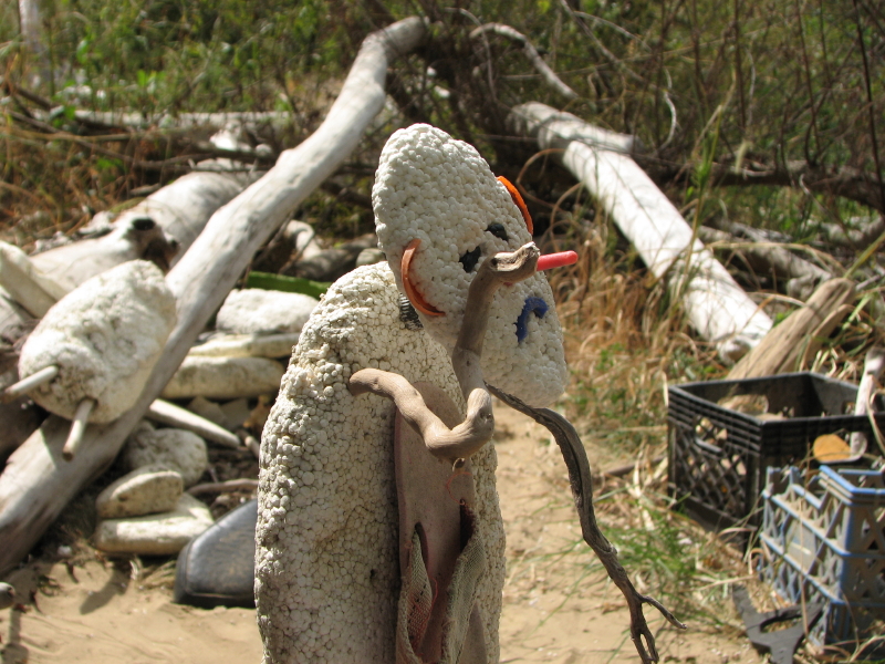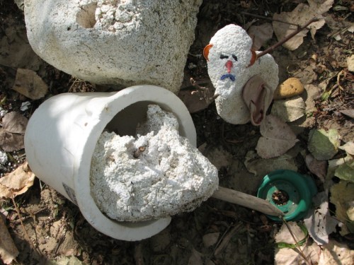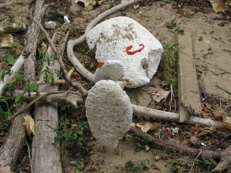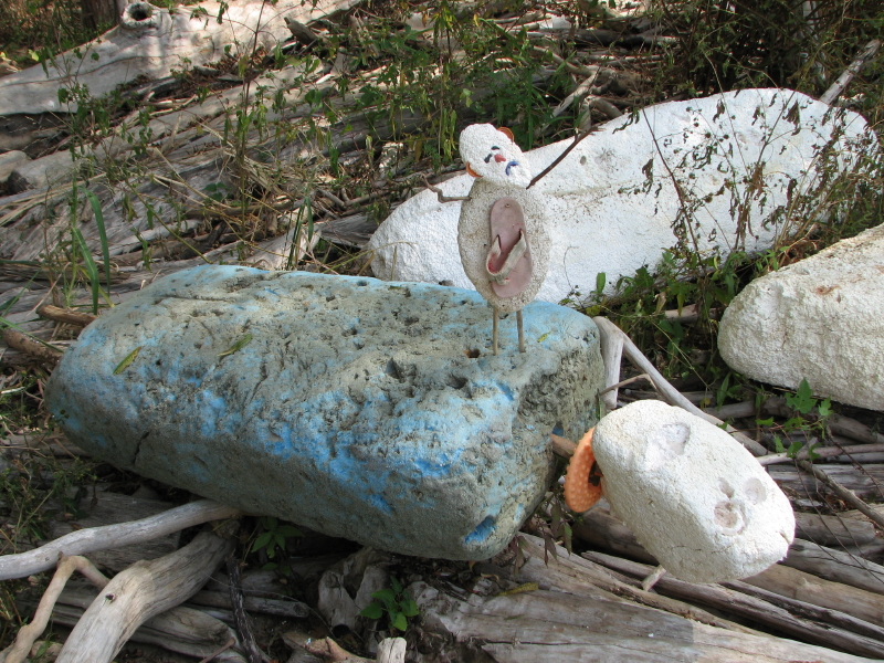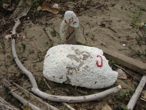 This is all that remains of Minnie now…fragments of broken Styrofoam. Minnie was an interesting character and people seemed to relate to her. More than likely all this carnage is the handiwork of adolescent boys. I have seen this before…many times over the years. What is it in the human spirit that finds some strange satisfaction at tearing down what has been built by others? I don’t understand the pleasure derived from this kind of destruction? I will admit to feeling down after I encountered all this trauma and I haven’t been back to this site since then. I did gather up what I could and I intend to make new works if I can lift my spirits up enough to do it. For now, all that remains are photographs of these sculptures when they existed intact and in the contexts that helped to define them. Here are a few previously unpublished images.