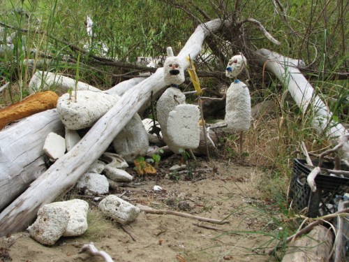 It’s not an encouraging sight. All these sculptures had been up here for weeks and many people have had the opportunity to see them and interact with them in positive ways. Among the other options included taking them home, moving them to another location at the Falls, adding to them in some other creative way, leaving them be until the river eventually found them, etc… Unhappily, the option exercised was just to smash them with sticks. One other figure was also out here and unfortunately, she lasted only long enough for one good post until she too was discovered by the vandals.