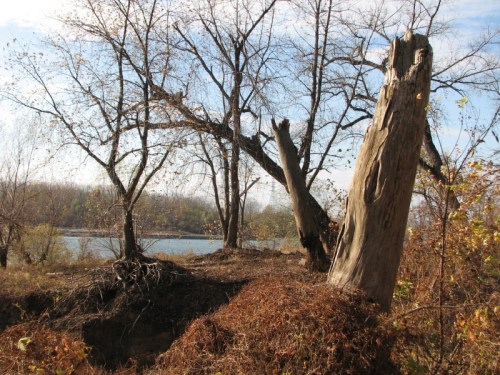 There’s drama walking through the autumn landscape. The colors and forms are beautiful and so much change is occurring so suddenly that it holds your interest and makes even the unobservant aware of the fleeting nature of life. The season is also a reminder of unrealized ambitions and unmet goals. Whatever urgent dreams you may harbor, better happen sooner than later because time waits for no one. Recently, I caught up with a friend at the Falls of the Ohio who I don’t see often enough and he told me this interesting story he witnessed about a buddy of his. The following images are as they impressed themselves upon my imagination as the tale was told.