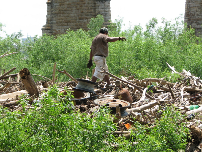 I ran into this fellow on a couple of occasions and each time he was doing the same thing. He was salvaging the metal wheels from these tires. He would cut away the rubber and take the metal rims with him to the salvage yard. He seemed thrilled that there were so many wheels out here. I also see people collecting driftwood to decorate their gardens and to make arrangements with fake flowers that they could then sell. One man I spoke with said he received $25.00 an arrangement. Based on the mental image I formed of his driftwood art, it didn’t sound all that appealing to me. But I need to not be so judgemental in such matters since as this blog is proof of…beauty and utility are in the eyes of the beholder! Here’s to another year of river art and adventure at the Falls of the Ohio.