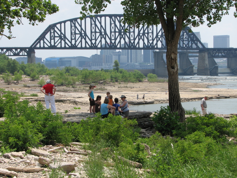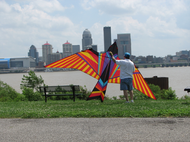 I have been to the Falls of the Ohio this year and made something from the junk I’ve found, but this is not that post. As 2010 was winding down, I looked at the year’s images to see if there were other stories that could be created from them. Yes, I found a few, however, what was really needed were more hours in the day. Before I could get to them…2010 became history. And so now, I’m doing a little backtracking and enjoying placing myself in a warmer landscape than currently occupies the view out my window. I had the idea of showing how other people enjoy recreating in this unique place. To begin, if the conditions are right, you can fly a kite. I came across this guy many months a go and I don’t think there was enough wind for him to get the lift he needed. Louisville, Kentucky can be seen across the river.