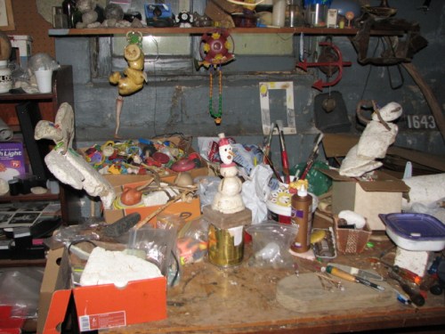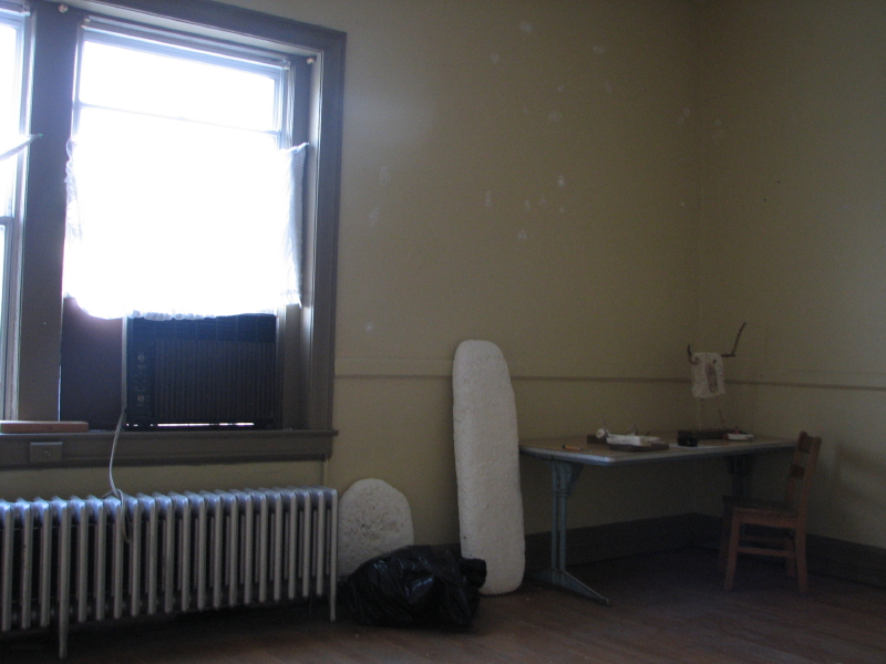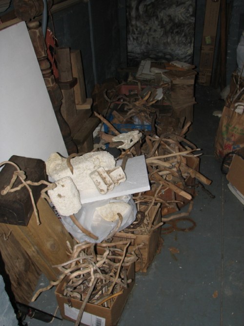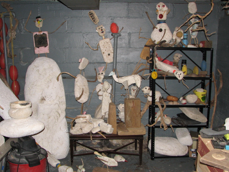 Perhaps the same people who made a mess of my outdoor studio set this up. A small doll that I had found months previously was decapitated and its head placed on this improvised “pike”. I took a few photos and left it be. Returning to my polystyrene cache, I decided to recycle some of the larger pieces that were now lying haphazardly on the ground and here are a few in process shots of the new sculpture I came to call “Big Red”.