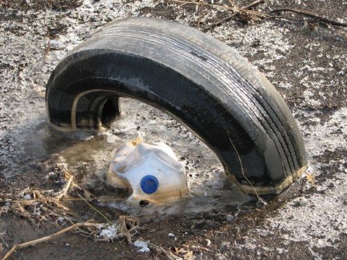 Cold, wet, and muddy Skippy entertains himself by looking for colorful or unusual artifacts such as these found on this trip. The joy in finding is its own reward.