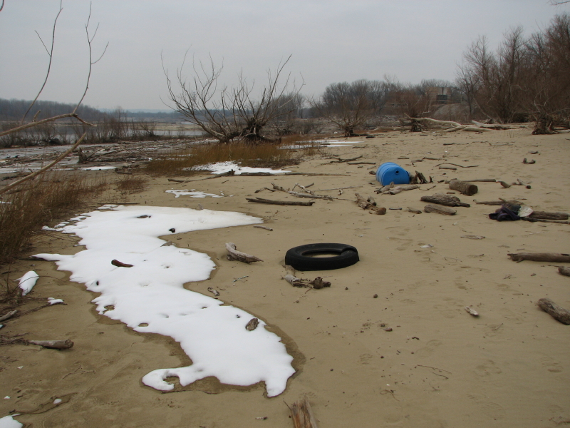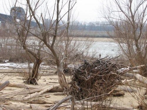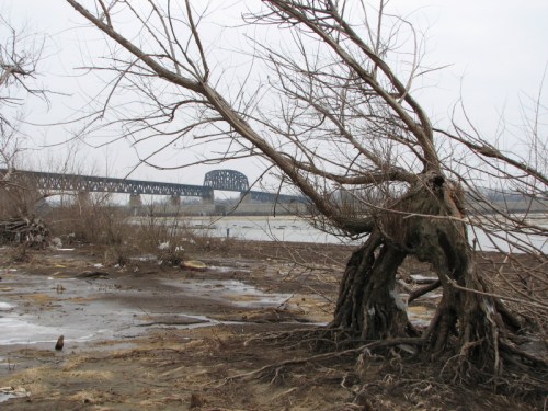 It’s the Falls of the Ohio and it’s nearly midwinter. The quality of the light feels like it’s coming from banks and banks of incandescent tubes in the sky. It doesn’t even feel like light, but more like a heavy presence more akin to fog than photons.