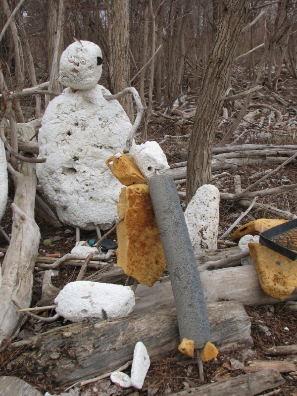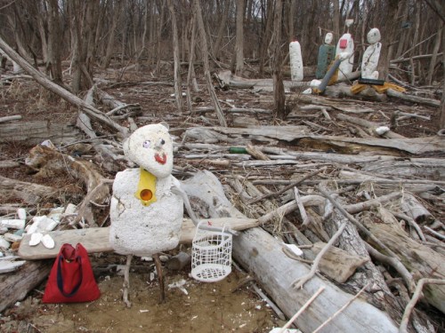 Meet “Skippy” who is named after the glass I used for one of his ears which came from the bottom of a peanut butter jar. I found it in the sand. The raised letters told me the brand name. “Skippy” is also made from Styrofoam found along the way, plastic fishing bobbers, rubber, a plastic mouth guard, and various woods. The “Choir” is visible behind the studio site.
