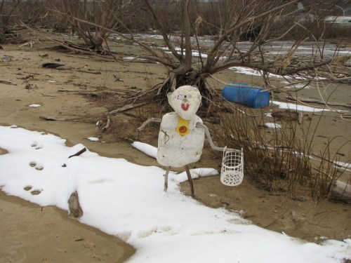 This is where I last saw Skippy. He was standing by the snow with a willow tree framing the view behind his head. The bright blue of a plastic drum adding a note of wondrous color in an otherwise drab riverscape. We have a way to go before Spring and everyone I know is already sick of winter. I’m going to try to stay positive and look for the beauty in the common place. I wonder what the groundhog’s shadow will say?