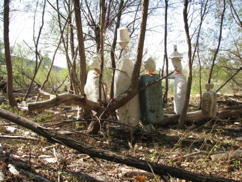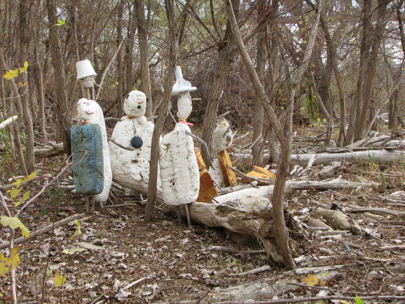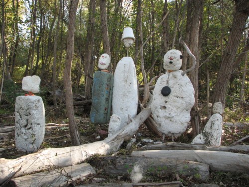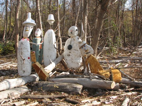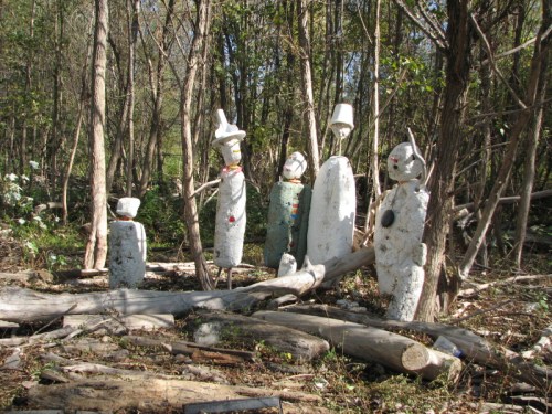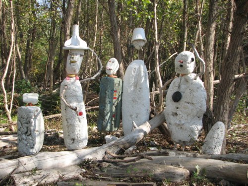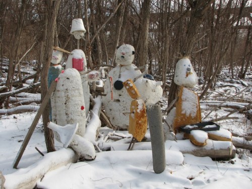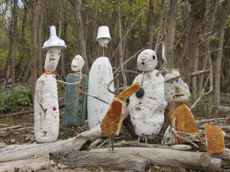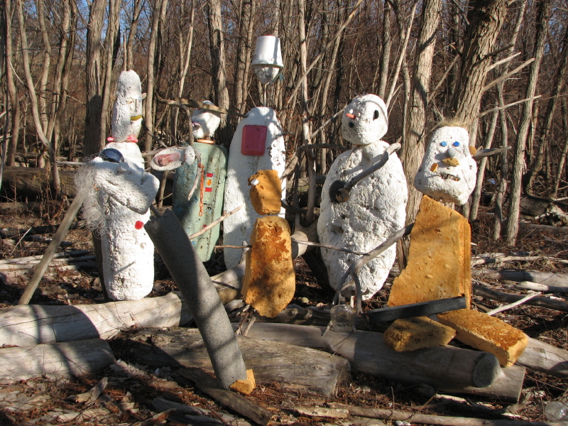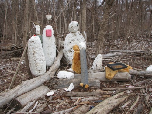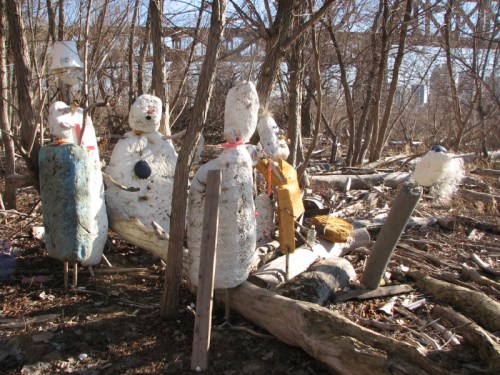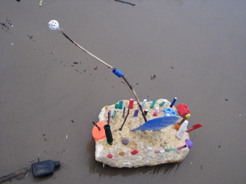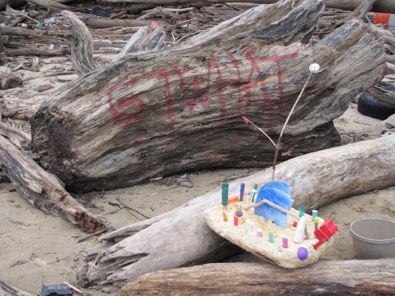 They have taken a recently washed up piece of Styrofoam and added some other found elements to improvise a toy raft. Jutting from the foam are many spent cigarette lighters ( you can always find these). There is also the red plastic flag from a mailbox…the kind you stand up to alert the postal carrier that you have outgoing mail. I can also see a larger piece of blue plastic, perhaps a sail? To me, it also resembles a shark fin. As much as I like this family’s creativity, I am however, dismayed by the graffiti on the side of the log. This is something I’m starting to see more of on the bridge and through out the park. It makes me wistful for the days when scrawling bad words and so and so loves so and so in the sand were sufficient means of expression.