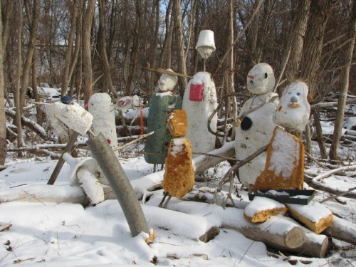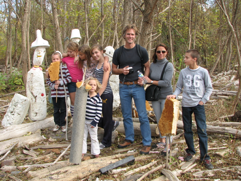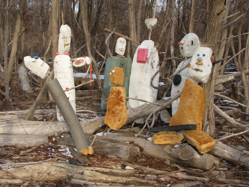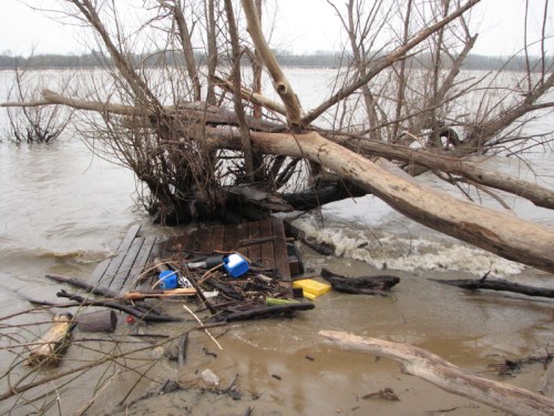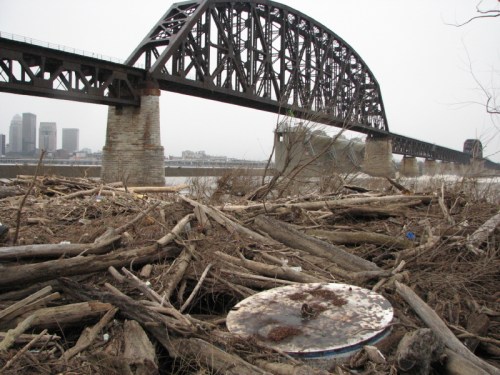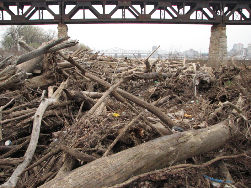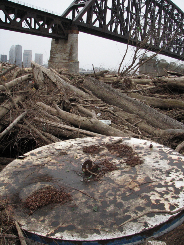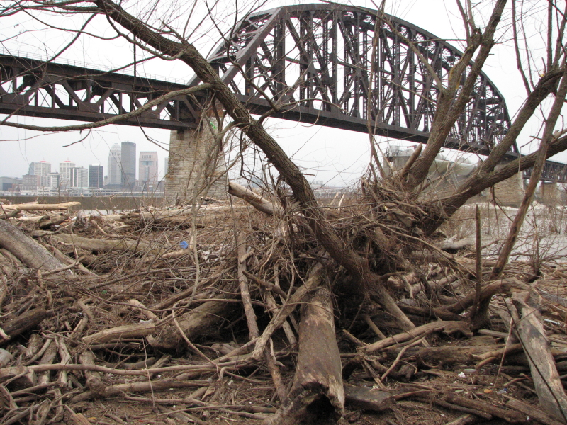 The river has given ground, but just a sliver of it. Although the waters have retreated, the Ohio River is still higher than usual. On the immediate riverbank is a new wooden obstacle course of washed away trees and huge logs. I find myself a walking stick and go exploring. I cover ground I have visited hundreds of times before and yet is made different with each episode of high water. I began this trip descending the frail cut lumber staircase whose bottom steps were recently covered by the river. I see a man and his children playing in the sand and pebbles and it looks like they are also building something. I wait for them to wander off to gather fresh materials before sneaking a closer peak.