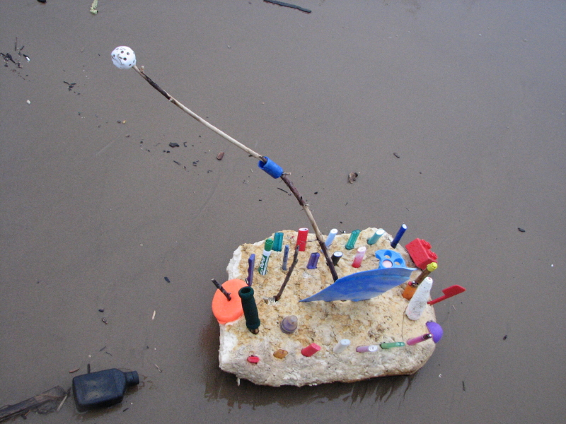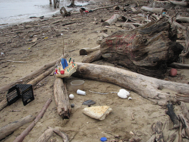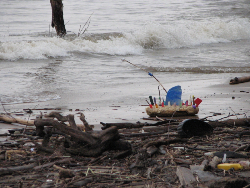 The walking stick comes in handy when you are not sure how deep the mud is in a certain area. You need to pick your path through by stepping on branches and broken planks. You can see brightly colored plastic just about everywhere you go. There are moderate to heavy waves along the river’s edge. Today I have a paper sack with me to collect the small river treasures carried by the water. This proves to be a mistake because the sack soon becomes water-logged and the bottom falls out.