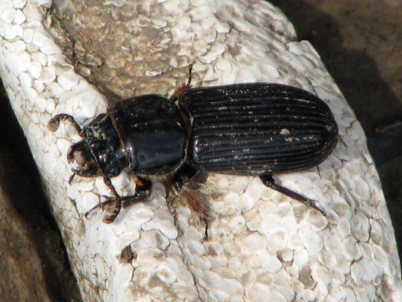 The Pileated Woodpecker has a large bill that goes through wood in a hurry. Carpenter ants and beetle larvae can be found in these decaying logs and make up the main diet of this magnificent bird. If you look closely at the photo above you can see a nice grub about to be swallowed. This bird was so intent on looking for food that I was able to get closer than usual to it. A couple of weeks a go, I found a Bessbug beetle which is a nice sized insect that uses decaying wood in its life-cycle. This beetle is also known as the Patent-leather Beetle. Here’s an adult I found sunning itself on a piece of Styrofoam. These beetles can get nearly two inches long or about five centimeters. I wonder if our country will ever adopt the metric system? Anyway, these beetle grubs make nice woodpecker snacks.