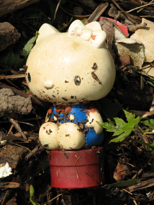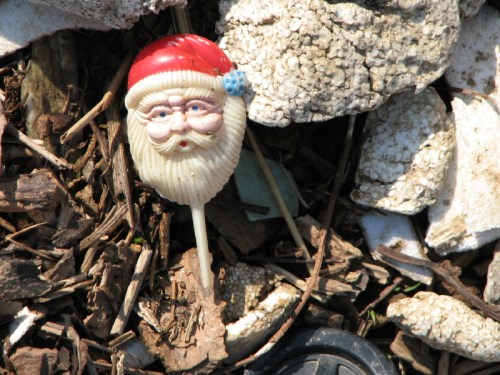 As you can see it’s mostly plastic containers, polystyrene (aka Styrofoam), and lots of shredded bark and wood chips. Every once in a while, something more interesting would turn up. While exploring, Mr. Blue Nose and I found two sign fragments and I kept these for my Found Painting and Sign Collection. Here are the two precious finds. The first one is kind of self-explanatory. I like to muse that this is one way the universe communicates to me by leaving these things in my path for me to ponder.