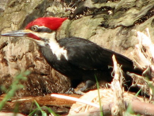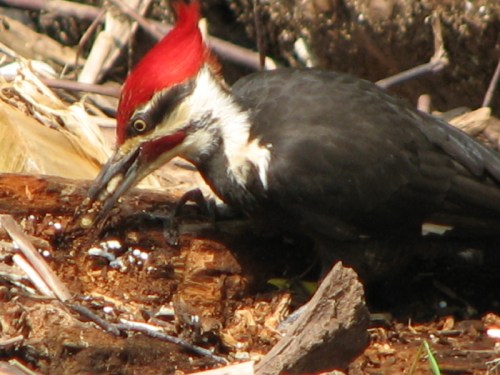 Since no one can verify that the Ivory-billed Woodpecker is still alive along some wild river in Arkansas…the Pileated Woodpecker has the distinction of being our biggest living woodpecker. For years, I have observed a pair of these crow-sized birds in the park. This one is the male and can be identified by his red mustache. The female lacks this and has more black on its head.