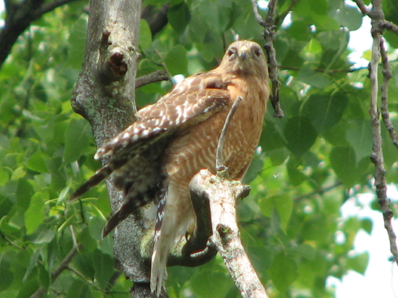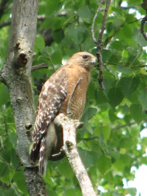 My friend said that he saw several blackbirds (grackles) chasing a larger bird from tree to tree. I have observed this behavior before when birds of prey are present. I gathered my camera up and went to see if I could find out what was the object of all this attention. It turned out to be this beautiful Red-shouldered Hawk. Here are a couple of pictures of it before the smaller birds drove it out of the area.