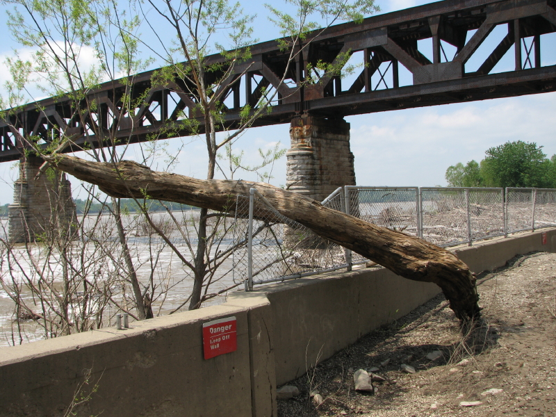 We parted near the railroad bridge and perhaps we will see one another again? My last image is from an overlook area popular with visitors who want a better view of the tainter gates. I have taken many pictures here over the years, but this one is different. To give you an idea of how high the river was…this log was deposited on the fence by the retreating river! Or, I hope so…I would hate to think it jumped up here! So long for now!!