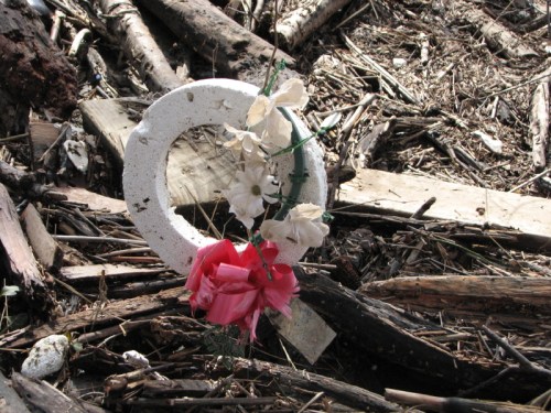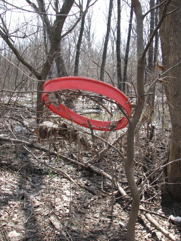 The above broken circle is a detail. Here is how this image first presented itself to me. It was swept into the trees by the water.