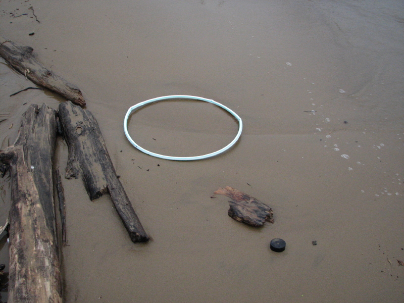 I came across a partial quote from Black Elk recently that served as a jumping off point for this post. He said: “Everything the Power of the World does is done in a circle.” From the rising of the sun to the changing of the seasons it doesn’t take one long to find examples in our lives that illustrates this. The Ohio River has been at its highest for the greatest length of time since I began this Falls of the Ohio project in 2003. We have had a lot of rain. In fact April was Kentucky’s wettest since records have been kept in the 1870s with nearly 14 inches of rain. I tell you it seemed like more than that to me. The month of March was also a wet one which caused the river to rise high too. Following are images that were taken after that first bit of high water. The theme this time is found circles and here are a few recent pictures. The first image is the washed up plastic hoola-hoop defining a circle in the wet sand. Here’s another found circle.