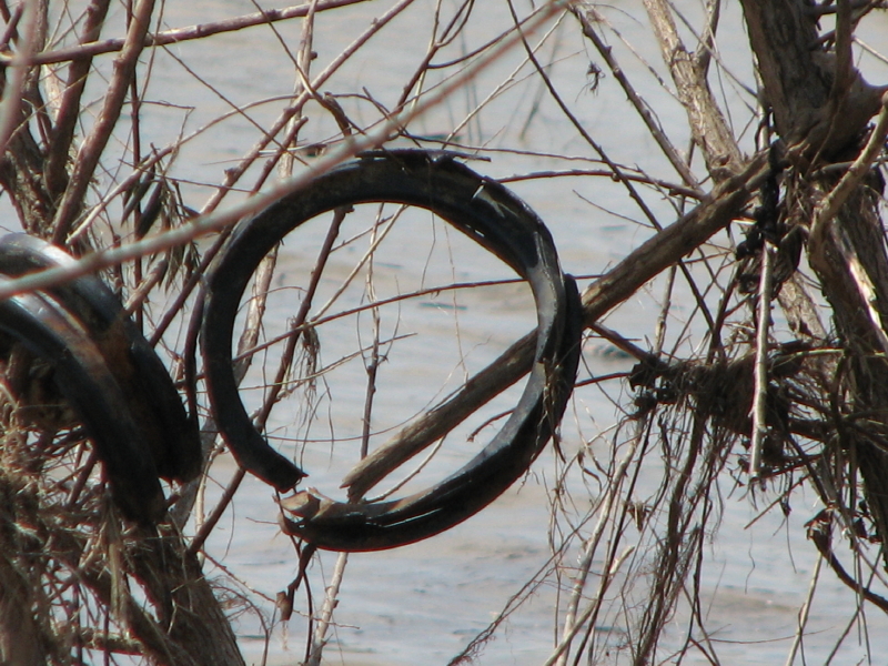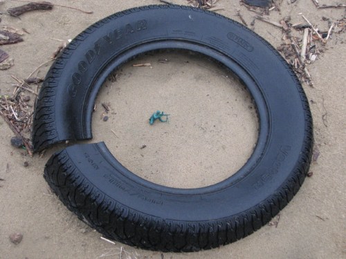 I find so many automobile tires in proximity to the river that I almost stop looking at them. But, their circular shapes always seem to catch my eye. Here’s one recent tire with a small toy guarding the center space.