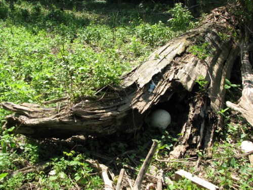 First, I would like to thank all the people who checked out my last post on the box turtles. The response has been pretty overwhelming and I’ve enjoyed everybody’s comments. The Eastern Box Turtle isn’t the only turtle to be found at the Falls of the Ohio State Park and this post is about that other mysterious and rare reptile. It’s called the Cottonwood Turtle (Terrapene populus) and its habitat overlaps that of the box turtle. On a warm and humid morning I was exploring the eastern section of the park around the debris line formed by a retreating Ohio River. Plastic bottles and containers and the ever-present polystyrene chunks helped define the high-water mark. We have had so much rain here and it’s officially Kentuckiana’s wettest spring on record! I was mesmerized watching and listening to the Cedar Waxwings pursuing each other from mulberry tree to mulberry tree and whose fruits are just now beginning to ripen to a glossy black. The air was filled with the fine downy fluff produced by the catkins of our giant cottonwood trees and seemed like so much snow falling in ultra slow motion. The chances of inhaling this fluff are real and white airy drifts were forming on the ground where the air currents pushed this gossamer material with its tiny secret of seeds within. With so much going on, I was surprised to catch a slight bit of movement inside a nearby hollow log. I remained still and this is what I saw.