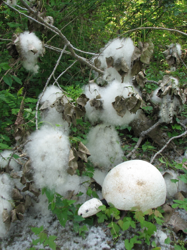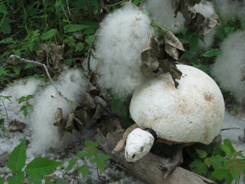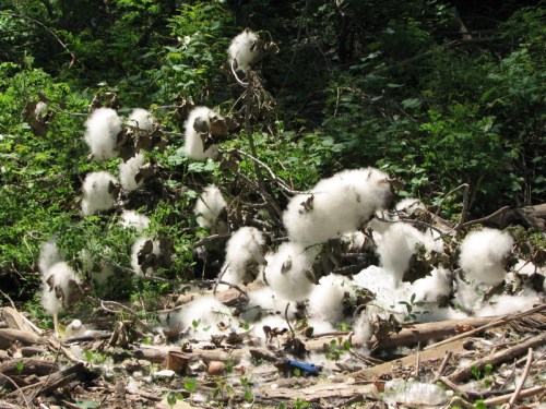 It occurred to me on my walk back through the tangle of bottomland, that this turtle might be benefitting the tree as well? I haven’t heard or read anything concerning a link, but what if? The fluff contains minute seeds and the act of burying them might aid in propagating this tree. The turtle places these seeds a little deeper than usual which might encourage stronger and deeper root growth. Since this area is frequently altered by the river, it would make sense for the tree to have a deeper hold on the soil? I came across another downed cottonwood branch and admired all the fluff it was producing. It all looked so beautiful and magical in broad daylight.