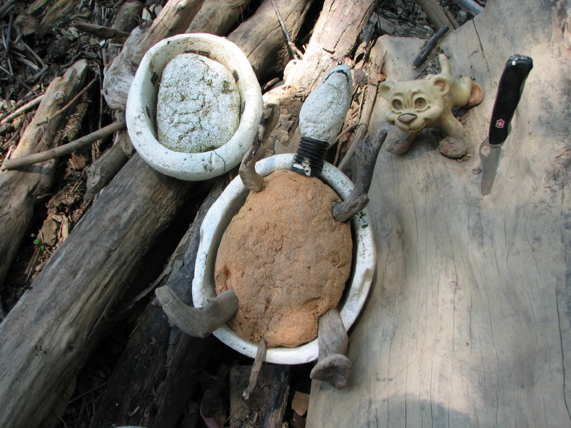 I used three pieces of Styrofoam…the shell, head, and one piece under a chunk of fiberglass-like material to fill the space inside the helmet. Limbs are pieces of found wood attached to the lightweight fiberglass. Everything is joined and pegged together with wood skewers. I did use some found plastic for the actual neck and mouth of the turtle. The eyes are round lead fishing weights and the nostrils are pieces of coal. Thanks for tagging along!