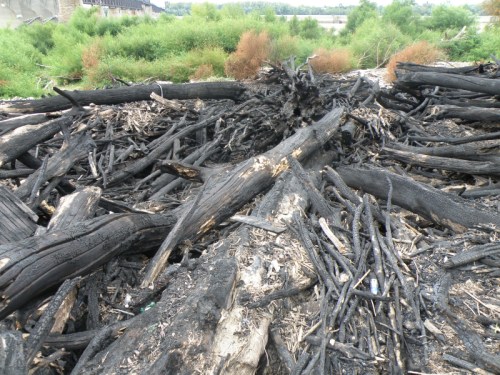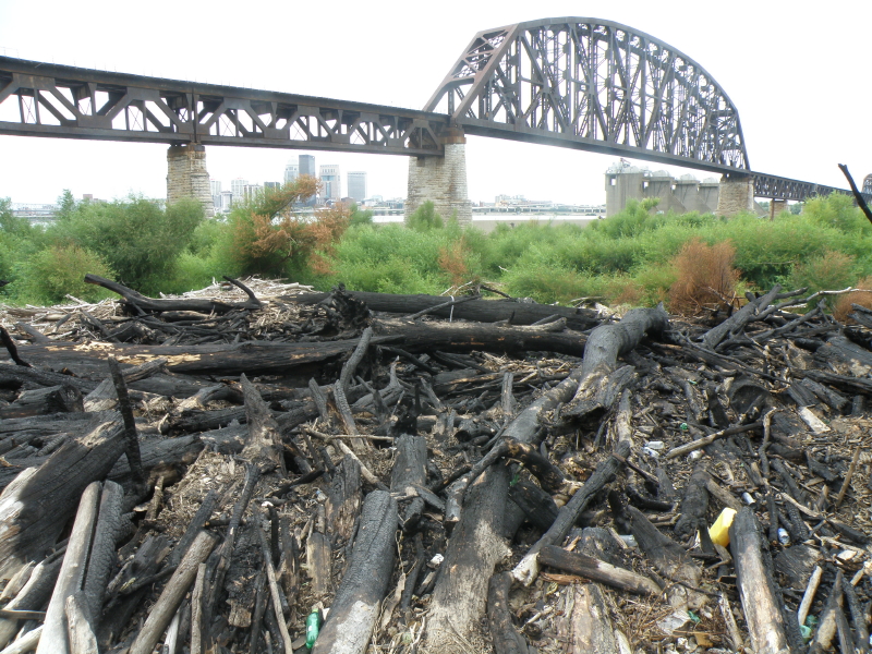 I was looking for materials for a new project I’m working on and came upon this event on the driftwood pile at the Falls of the Ohio. There is so much wood massed and interlocked with itself that I wondered if fire could be a possibility here? The answer to that question is obviously yes.