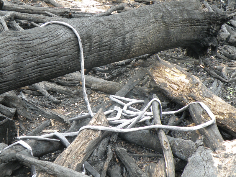 One thing I know was that someone tried to put this fire out. I came across quite a length of fire hose that had been cut. The canvas and rubber hose bore a stamp that said it was made in Canada. Perhaps the hose was severed because the fire swirled quickly becoming unpredictable and all this wood presented many opportunities for hang ups and snags. It would be hard to maneuver over it. Seems there was a cut and run moment and the hose was left behind. A sculptor friend of mine, Don Lawler, said that cut lengths of fire hose are perfect for protecting the edges of his limestone sculptures when he hoists them into to position with his ropes and crane. I think I will salvage some of this hose for my sculptor friends.